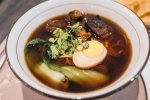 Le karaage est un plat japonais de viande panée, traditionnellement du poulet. Ici présenté en salade accompagné d'oeufs de caille, d'endives, quelques autres verdures, ainsi qu'une vinaigrette au goût umami légèrement crémeuse avec une pointe de soja. Je verse la vinaigrette sur les ingrédients servis "sec", et c'est parti : bah, c'est juste une salade... Le poulet quand à lui n'est pas sec, le morceau semble être de la cuisse, un peu gras et gourmand. La panure est croustillante, pas trop huileuse, mais c'est un peu trop cuit avec un léger goût de cramé, dommage. Une proposition de recette originale, mais qui ne me séduit pas plus.